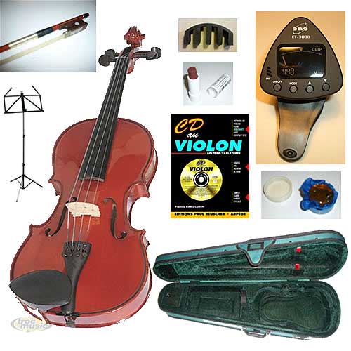 Violon enfant d'étude, taille 1/2 : fond érable, touche et chevilles ébène + archet, étui, accessoires, méthode CD.