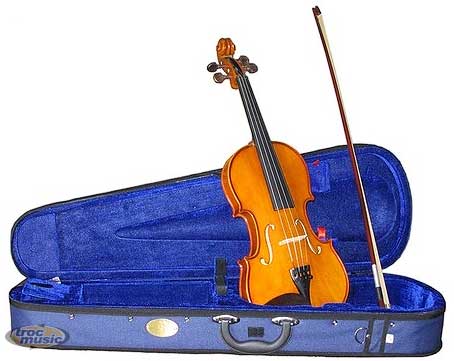 Violon pour enfant taille 1/4. Table massive, fond érable. Touche, chevilles palissandre, chevalet Aubert, cordier Wittner, 4 tendeurs. Archet crin naturel. Livré avec étui.