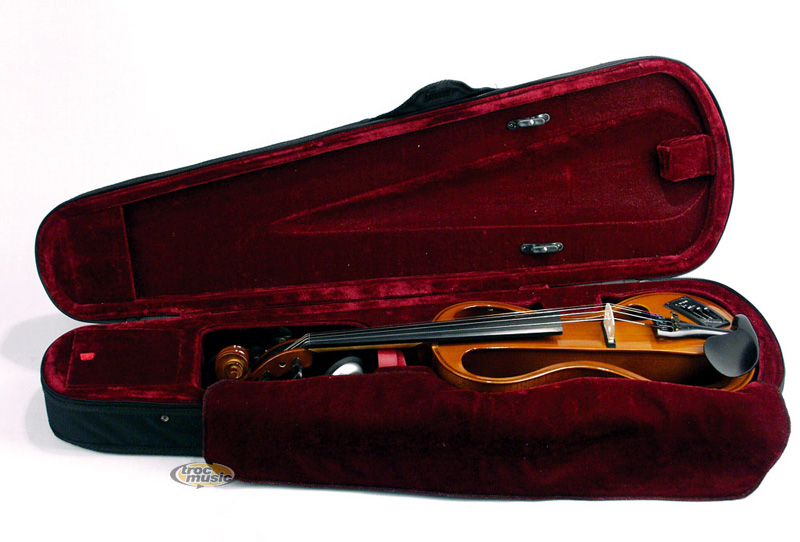 Violon éléctrique équipé d'un systéme de micro réglable et prise pour casque audio ou amplificateur. Table massive en épicéa, corps massif en érable, finition vernis brun-doré. Eléments en ébène, chevalet en érable, cordier avec réglage fin et cordes en acier poli. Ensemble fourni avec casque audio et étui.