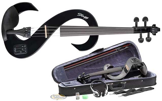 Violon électrique 4/4 silencieux noir. En bois massif verni, pourvu de 4 réglages d'accord fin, 1 équaliseur 2 bandes et volume, 1 préampli pour casque, 1 sortie jack 6,3 mm standard, 1 sortie mini jack 3,5 mm pour casque. Livré avec sangles, archet, colophane, casque stéréo, pile 9 v.