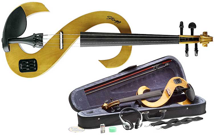 Violon électrique silencieux 4/4, avec softcase, sangles, archet, colophane, casque stéréo, pile 9 v. Couleur miel.