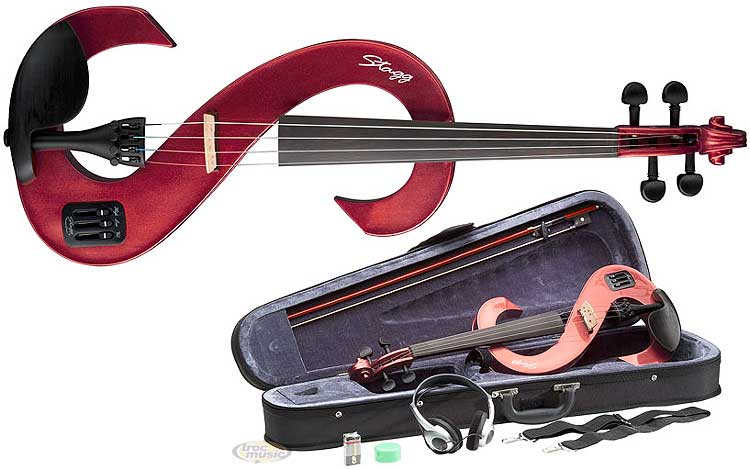 Violon électrique rouge métallisé en bois massif verni, pourvu de 4 réglages d'accord fin, 1 équaliseur 2 bandes et volume, 1 préampli pour casque, 1 sortie jack 6,3 mm standard, 1 sortie mini jack 3,5 mm pour casque.