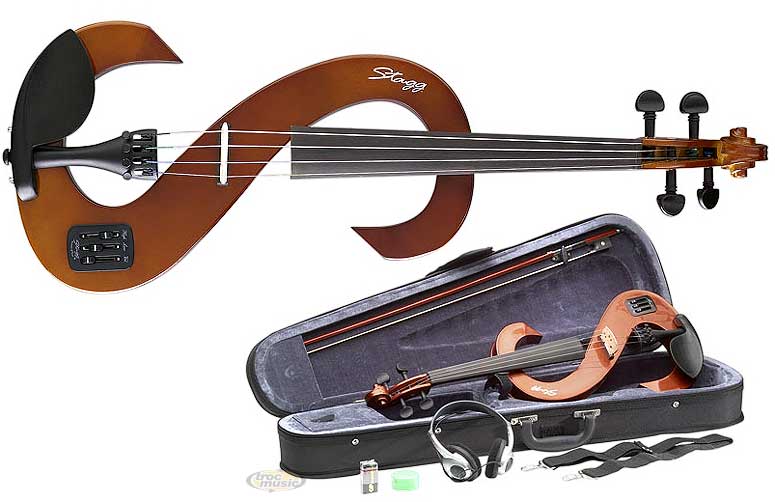 Violon électrique 4/4 couleur violinburst. Violon silencieux en bois massif verni, pourvu de 4 réglages d'accord fin, 1 équaliseur 2 bandes et volume, 1 préampli pour casque, 1 sortie jack 6,3 mm standard, 1 sortie mini jack 3,5 mm pour casque. Livré avec sangles, archet, colophane, casque stéréo, pile 9 v.